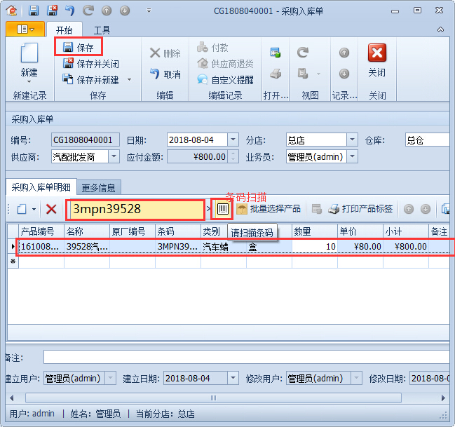 2、在采購入庫單明細中根據(jù)到貨單,掃描或輸入商品條碼將產品入庫,再將產品的數(shù)量填入系統(tǒng)中,保存即可。如圖: