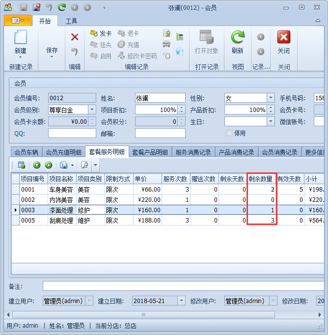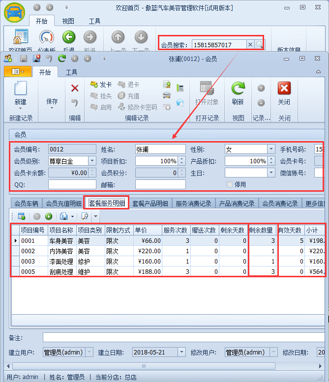 汽車美容店的會員到店消費已購買的套餐服務,店員根據會員提供提供的電話號碼或姓名,在傲藍汽車美容軟件的搜索欄中快速搜索出會員資料,查看會員資料中剩余可以用的套餐服務次數,如圖: