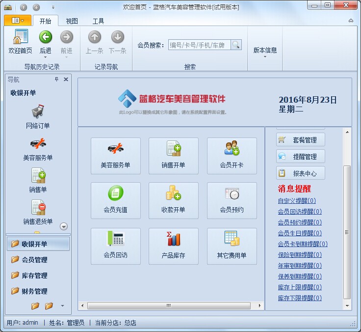 汽車美容會員管理軟件的常用功能,點擊相應功能的按鈕即可快速進入各種功能界面,點擊工具欄中的“歡迎首頁”按鈕可以在任何視圖中打開歡迎界面。