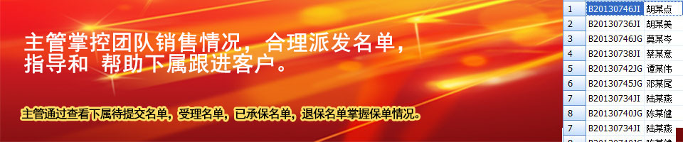 • 主管通過查看下屬待提交名單、受理名單、已承保名單或退保名單可了解保單的情況,通過查看救援卡名單可了解救援卡進度;