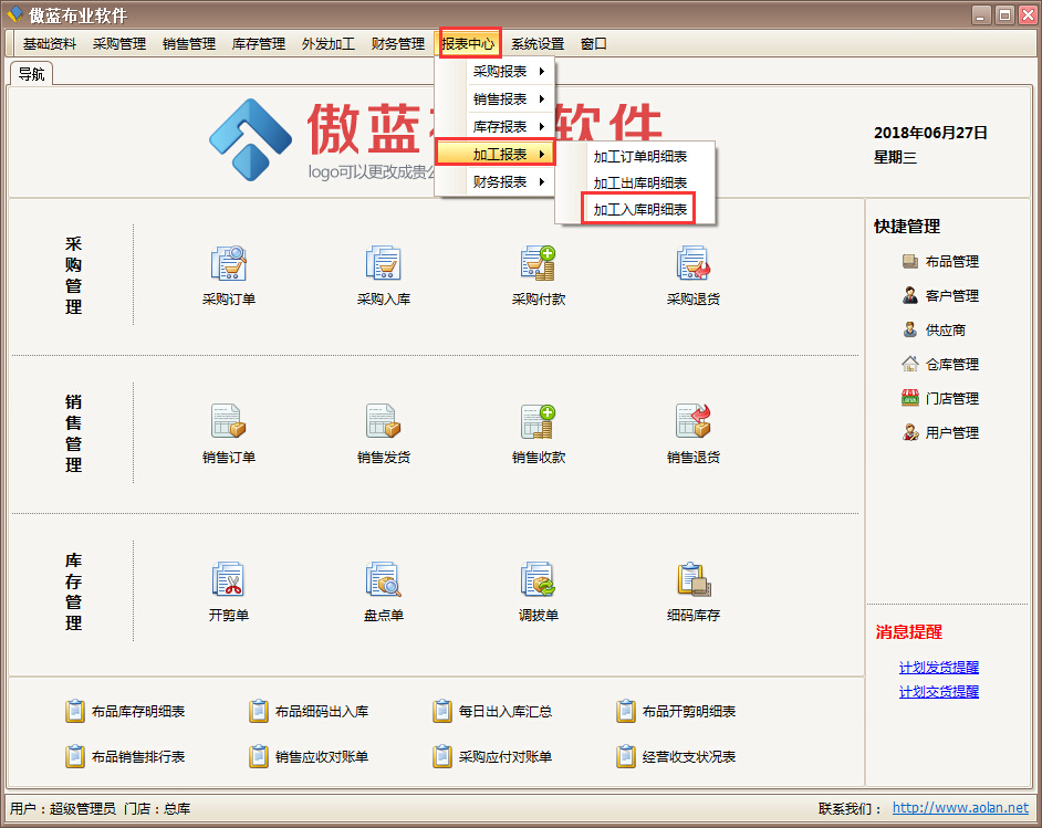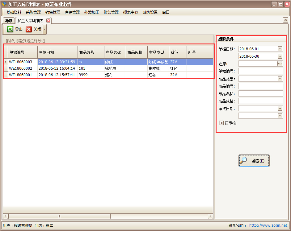 傲藍(lán)布業(yè)管理軟件查看加工入庫(kù)的布匹情況報(bào)表: