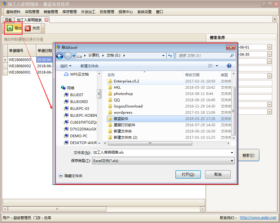 導(dǎo)出是把當(dāng)前列表中所有的記錄以 Excel 表格方式導(dǎo)出。在加工入庫(kù)明細(xì)表列表界面上,點(diǎn)擊【導(dǎo)出】按鈕。
