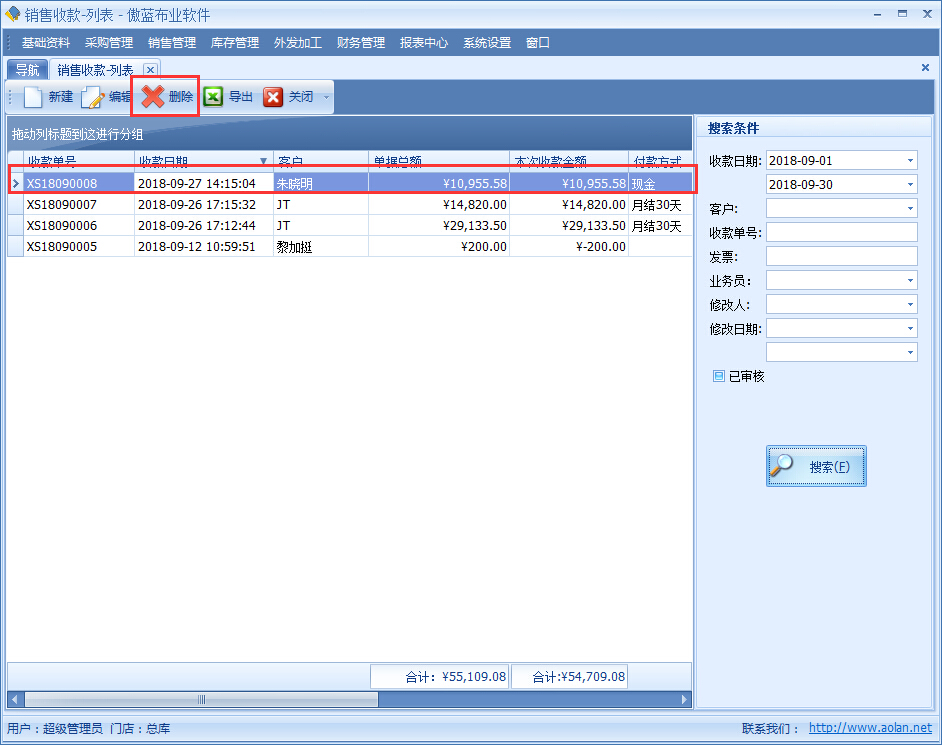 如需要對銷售付款中某一條數據進行刪除的,通過銷售付款列表界面,選中一條記錄。點擊【刪除】