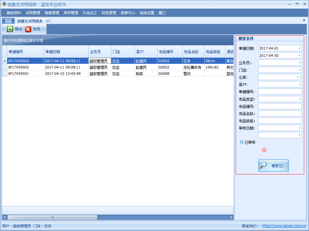 傲藍布業軟件銷售發貨明細表:記錄所有的銷售發貨記錄。在表中詳細記錄了銷售日期,業務員,門店,客戶,布品編號,布品名稱,布品規格,顏色,單價,數量,售出總價等信息。
