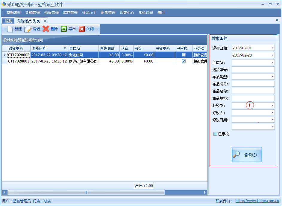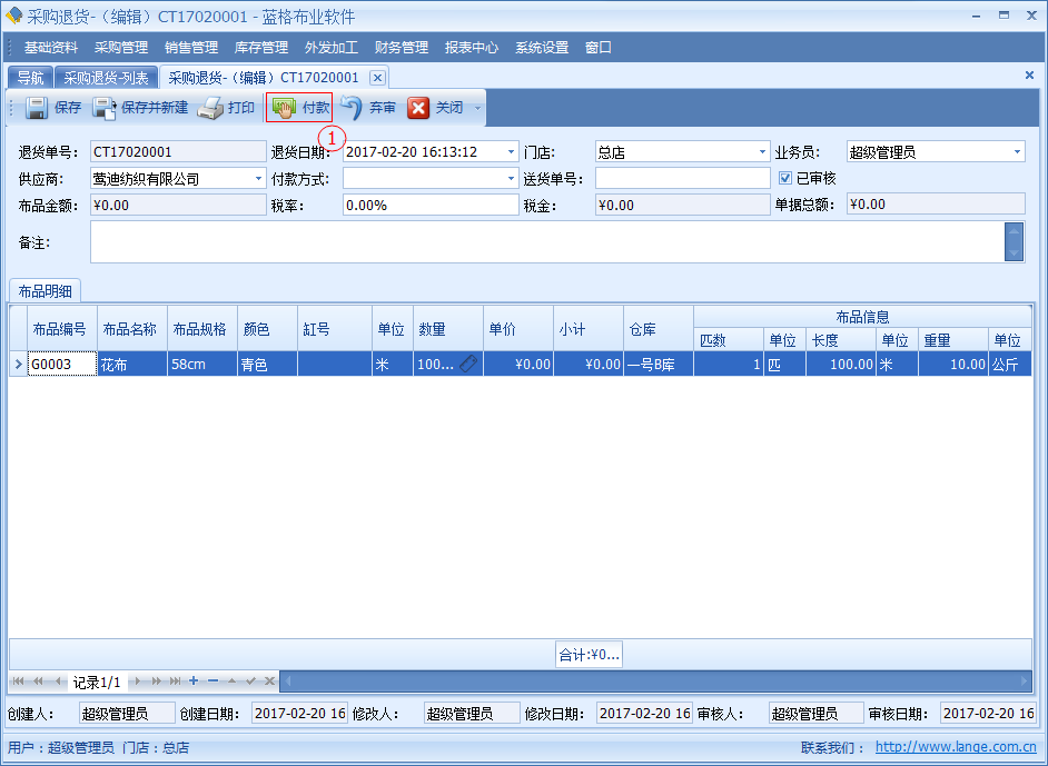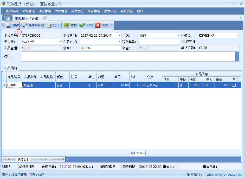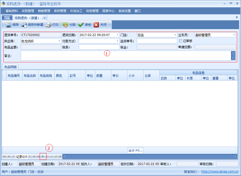 當(dāng)采購布品回來時(shí)發(fā)現(xiàn),布品中有破損、布品不對(duì)或者其他情況需要退貨給供應(yīng)商,并且取回來已經(jīng)支付給供應(yīng)商的布匹款項(xiàng)。傲藍(lán)好布業(yè)軟件中可以通過【采購?fù)素洝縼聿僮鳌2少復(fù)素泦螕?jù)包括退貨日期、要退貨的采購單、供應(yīng)商、倉庫、金額等信息。明細(xì)列表中包括單據(jù)要退貨的布品名稱、顏色、單位、數(shù)量、明細(xì)碼價(jià)格等詳細(xì)數(shù)據(jù)。