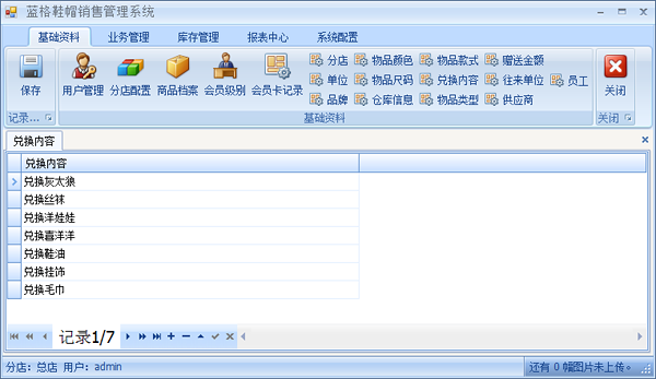 點擊傲藍服裝鞋帽銷售管理軟件的【基礎資料】->【積分兌換】就會進入會員積分兌換額界面。這可以設置每種兌換方式。如果不需要積分兌換的話,就全部刪除記錄。配置好以后點擊【保存】,設置好的數據就會生效。