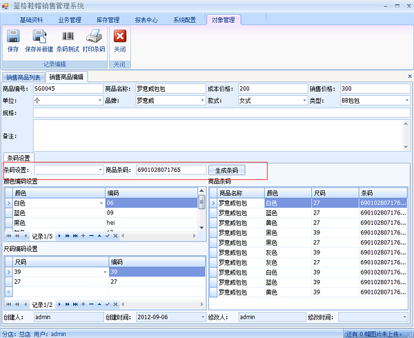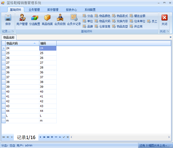 點擊【基礎資料】【物品尺碼】打開物品尺碼編輯界面,在這里添加物品尺碼。物品編碼是在物品生產條碼時加上物品尺碼編碼。填寫好以后點擊保存。