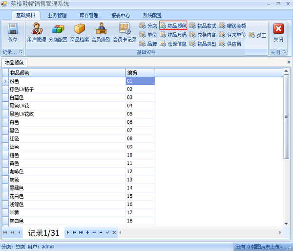 點擊【基礎資料】【物品顏色】打開物品顏色編輯界面,在這里添加物品顏色。物品編碼是在物品生產條碼時加上物品顏色編碼。填寫好以后點擊保存。