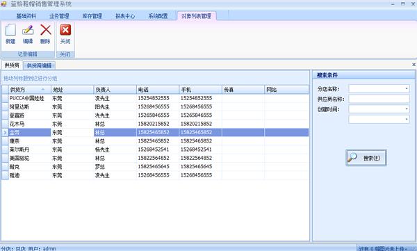 點擊【基礎資料】->【供應商】, 打開供應商列表界面,該界面可以進行查詢,查詢相關的供應商信息,雙擊該供應商打開供應商詳細信息界面。包括編輯供應商,刪除供應商和建立新的供應商三個功能。如下圖: