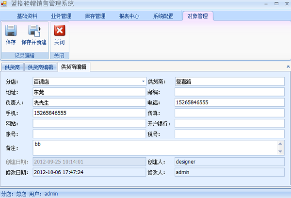 在上圖中點擊【新建】打開供應商編輯界面。添加好供應商相關的信息。然后點擊【保存】這樣就把供應商錄入到系統中。當在上圖中選擇一個供應商點擊【編輯】,在該界面中會顯示選擇供應商詳細的信息,修改其中的項目,然后點擊【保存】,供應商的信息就更新完成。