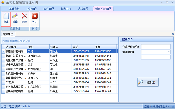 點擊【基礎資料】->【往來單位】,打開往來單位列表界面,這里顯示所有的添加往來單位的數據,可以對以前的數據進行編輯,刪除和建立新的往來單位。如下圖所示: