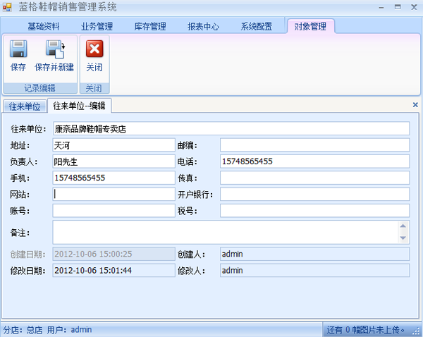在上圖中點擊【新建】,打開往來單位-編輯界面,在界面上填寫相關的信息。填寫好之后點擊【保存】,這樣就包往來單位錄入到系統中了。