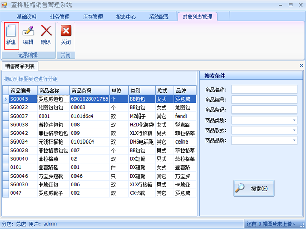 點擊【基礎資料】【商品檔案】打開銷售商品列表,這里顯示所有的商品基本信息。在搜索條件中輸入相關信息進行查找。