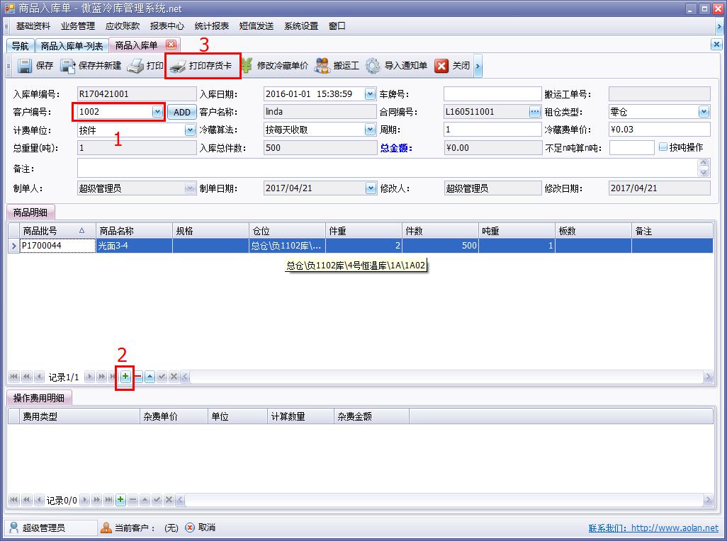 步:選擇要入庫(kù)的客戶,第二步:添加要入庫(kù)的商品,填寫好入庫(kù)信息保存后,第三步:把存貨卡打印給客戶,如圖: