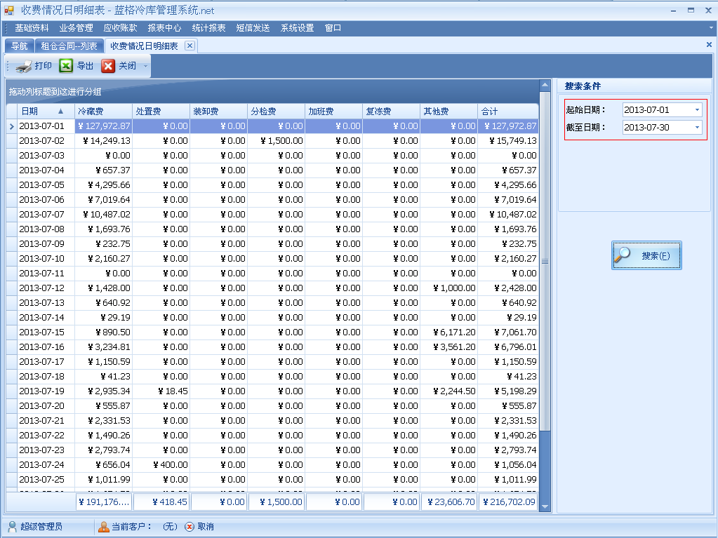 冷庫企業中,通常重視的是冷庫的營業收入情況和冷庫庫存量的變動,傲藍冷庫信息管理系統能滿足冷庫業務中需要的需求。例如明確的了解冷庫每天的收入情況 ,系統中的報表中心,有個“收費情況日明細報表”。