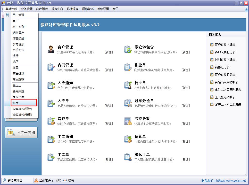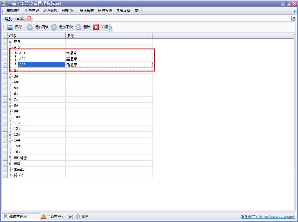 傲藍冷庫費用結算系統,倉庫/倉位管理功能,可以建立多個倉庫以及倉位,多倉庫與倉位的設定,有利于冷庫企業管理倉庫存貨,以及貨物的出入庫。
