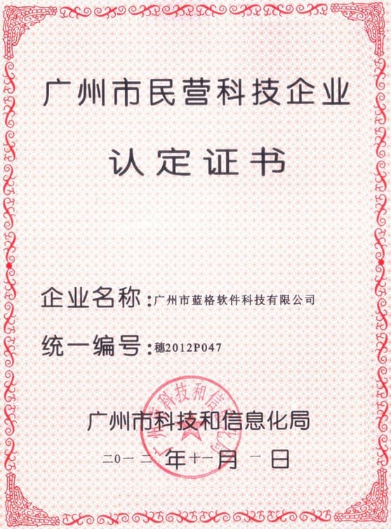 傲藍軟件高新技術企業證書