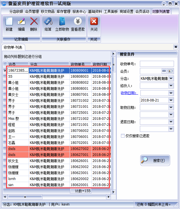收物單是會(huì)自動(dòng)保存當(dāng)前登錄皮具護(hù)理店,在收物物單列表界面中可以搜索每個(gè)分店的收物單以及收物單信息,雙擊皮具護(hù)理店連鎖管理軟件選擇單據(jù)就可以打開(kāi)該收物單查看到衣物明細(xì)來(lái)記錄。