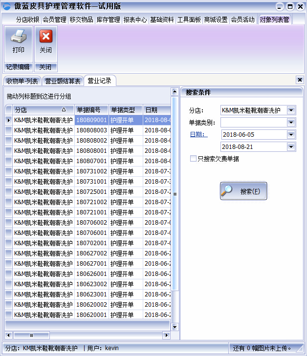 皮具護(hù)理店連鎖管理軟件在【報(bào)表中心】【營(yíng)業(yè)記錄】表中可以根據(jù)分店搜索每個(gè)分店的單據(jù)付款信息。