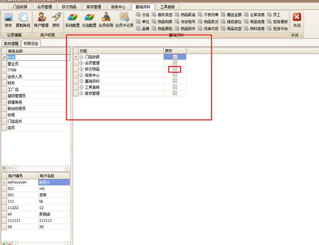角色添加好后就能給相應的角色設置權限,讓每個角色只操作自己相應的系統(tǒng)功能。選中角色,在右邊的對話框的授權里打鉤,角色就能操作相應的系統(tǒng)功能,如下圖所示: